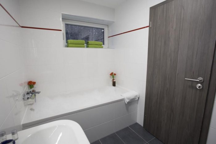 Bad mit Badewanne, Toilette und ein Audiosystem