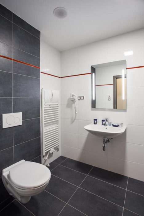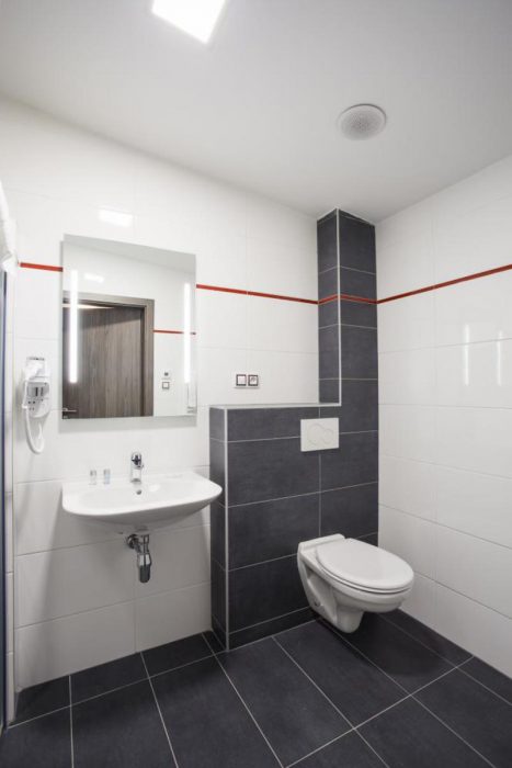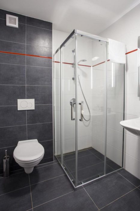 Bad mit Dusche, Toilette und ein Audiosystem